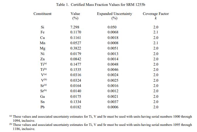 NIST SRM 1255b - 鋁合金356(圓盤形) 中成分的認(rèn)證值列在表 1 中,作為鋁基體中元素總量的質(zhì)量分?jǐn)?shù) [1]。 NIST 認(rèn)證值是 NIST 對其準(zhǔn)確性有最高置信度的值,因?yàn)樗幸阎蚩梢傻钠顏碓炊家芽紤]在內(nèi)。認(rèn)證值是對真實(shí)值的當(dāng)前最佳估計(jì)。認(rèn)證值在計(jì)量上可追溯至以百分比表示的 SI 派生的質(zhì)量分?jǐn)?shù)單位。每個(gè)規(guī)定的值是來自多個(gè)實(shí)驗(yàn)室的三種分析方法的結(jié)果的未加權(quán)平均值。隨數(shù)值列出的不確定度是擴(kuò)展的不確定度,使用列出的覆蓋因子 [3-5] 以大約 95% 的覆蓋率表示。