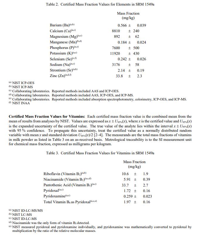 表 1 至表 3 提供了 SRM 1549a 中膽固.醇、元素和維生素的認證質量分數值(按原樣報告)。 NIST 認證值是 NIST 具有最高置信度的值在其準確性方面,所有已知或可疑的偏見來源都已被考慮到[1]。 NIST 和合作實驗室對價值分配進行了分析。認證值計算為 NIST 方法的平均值和合作實驗室提供的平均結果的中位數(在適當的情況下)。相關的不確定性以大約 95% 的置信水平表示 [2-4]。
