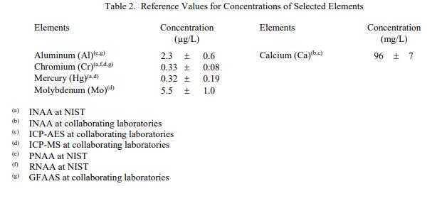 表 2 中提供了其他元素濃度的參考值。參考值是非認(rèn)證值,是對真實(shí)值的最佳估計(jì)。但是,這些值不符合 NIST 認(rèn)證標(biāo)準(zhǔn),并且提供了相關(guān)的不確定性,這些不確定性可能僅反映測量精度,可能不包括所有不確定性來源,或者可能反映多種分析方法之間缺乏足夠的統(tǒng)計(jì)一致性 [2]。
