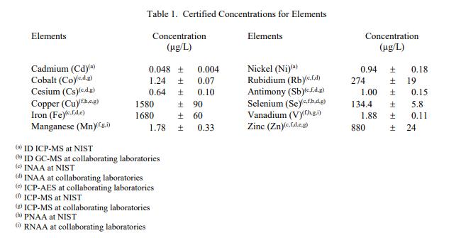 表 1 中提供了元素濃度的認(rèn)證值。認(rèn)證值基于 NIST 進(jìn)行的主要分析技術(shù)的結(jié)果,或者 NIST 獲得的兩種或多種化學(xué)獨(dú)立分析技術(shù)的組合結(jié)果,以及合作專家實(shí)驗(yàn)室 [2]。 NIST 認(rèn)證值是 NIST 對其準(zhǔn)確性具有最高置信度的值,因?yàn)?NIST 已調(diào)查或說明了所有已知或可疑的偏差來源。