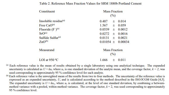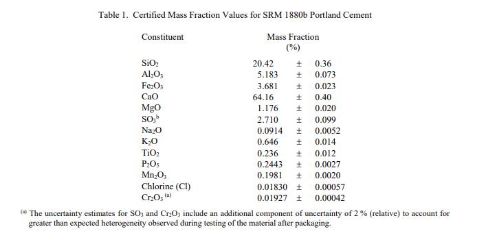 SRM 1880b 中成分的認證值在表 1 中以質量分數(shù) [1] 的形式在收到時報告。 NIST 認證值是 NIST 對其準確性具有最高置信度的值,因為所有已知或可疑的偏差來源都已被調查或考慮在內 [2]。認證值是根據(jù) NIST 和合作實驗室使用附錄中列出的儀器和經(jīng)典測試方法進行的分析結果對真實值的當前最佳估計。