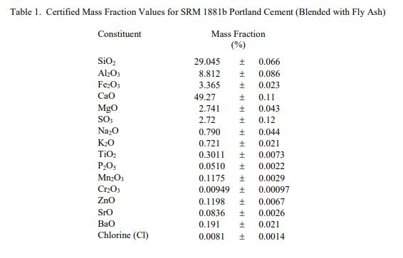 SRM 1881b 成分的認(rèn)證值在表 1 中報(bào)告為質(zhì)量分?jǐn)?shù) [1]。 NIST 認(rèn)證值是 NIST 對(duì)其準(zhǔn)確性具有最高置信度的值,因?yàn)樗幸阎蚩梢傻钠顏?lái)源都已被調(diào)查或考慮在內(nèi) [2]。認(rèn)證值是存在的真實(shí)值的最佳估計(jì)。