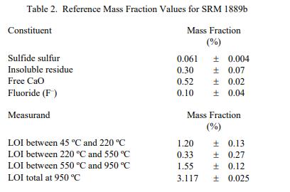 表 3 中報告了成分的信息值、環境溫度和 45 oC 之間的 LOI 以及總分析成分的信息值。信息值被認為是 SRM 用戶可能感興趣的值,但沒有足夠的信息來評估與值相關的不確定性 [2]。信息值不能用于建立計量溯源性。