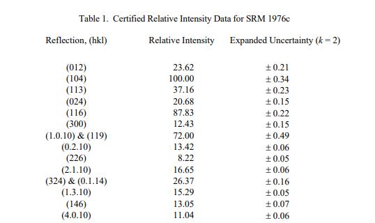 NIST 認證值是 NIST 對其準確性有最高置信度的值,因為所有已知或可疑的偏差來源都已被調查或考慮在內。被測量是表 1 中所示的相對強度(無量綱比)的認證值,以及表 2 中所示的晶格參數。計量溯源性是國際單位制 (SI) 單位,相對強度值是維度為一,對于晶格參數,維度是長度(以納米表示)。認證值和不確定度是根據 ISO/JCGM 指南 [1] 中描述的方法計算的。
