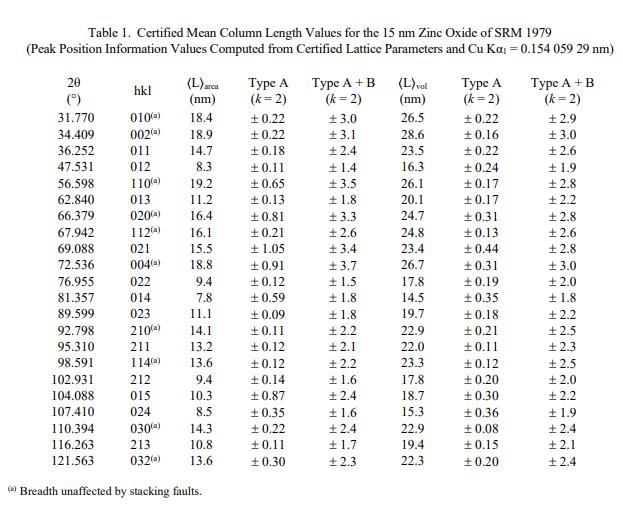 NIST 認證值是 NIST 對其準確性有最高置信度的值,因為所有已知或可疑的偏差來源都已被調查或考慮在內。被測量是經驗證的平均柱長,由 22 條衍射線的傅里葉分析確定,晶格參數為由 Pawley 分析確定。計量溯源性是國際單位制 (SI) 長度單位(以納米表示)。表 1 至表 4 中提供了認證值和不確定度,并根據 ISO/JCGM 指南 [3] 中描述的方法計算。