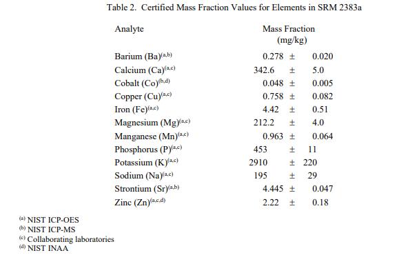 表 1 和表 2 中提供了 SRM 2383a 中類胡蘿卜素和元素的認證質量分數值,按原樣報告。NIST 認證值是 NIST 對其準確性有最高置信度的值因為所有已知或可疑的偏見來源都已被調查或考慮到[1]。價值分配分析由 NIST 和合作實驗室進行。