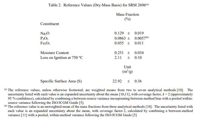 表 2 中列出了基于干質量 [3]、750 oC 燒失量和 SRM 2696 比表面積的成分參考值。參考值是代表最佳估計值的非認證值真實價值;但是,這些值不符合 NIST 的認證標準,并且提供了相關的不確定性,這些不確定性可能僅反映測量精度,可能不包括所有不確定性來源,或者可能反映多種分析方法之間缺乏足夠的統計一致性 [4]。