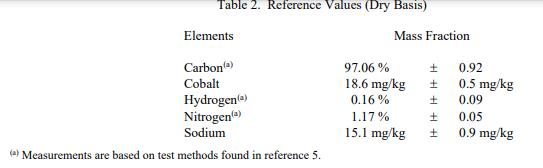 表 2 中提供了以干基質(zhì)量分?jǐn)?shù)表示的參考值。鈷和鈉的參考值基于單一 NIST 方法。碳、氫和氮的值基于 LECO 公司(密歇根州圣約瑟夫)執(zhí)行的單一方法,并得到實(shí)驗(yàn)室質(zhì)量服務(wù)國(guó)際代表 NIST 管理的實(shí)驗(yàn)室間分析研究結(jié)果的證實(shí)。參考值是對(duì)真實(shí)值的最佳估計(jì)的非認(rèn)證值;但是,這些值不符合 NIST 認(rèn)證標(biāo)準(zhǔn),并且提供了相關(guān)的不確定性,這些不確定性可能僅反映測(cè)量精度,可能不包括所有不確定性來(lái)源。