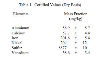 表 1 中提供了認(rèn)證值,以干基的質(zhì)量分?jǐn)?shù) [1] 表示。NIST 認(rèn)證值是 NIST 對(duì)其準(zhǔn)確性有最高置信度的值,因?yàn)樗幸阎蚩梢蓙?lái)源NIST 已經(jīng)調(diào)查或解釋了偏差。鋁、鈣、鐵、鎳和釩的認(rèn)證值基于兩種獨(dú)立的 NIST 方法。硫的認(rèn)證值基于單一的 NIST 主要方法。