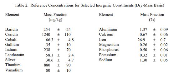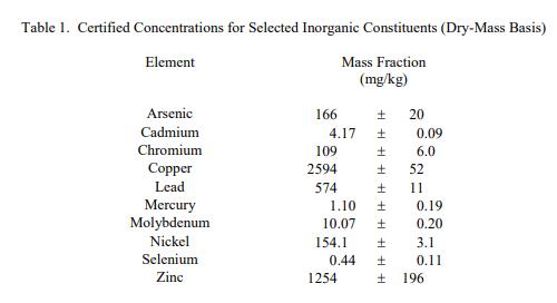 表 1 報告了十種元素的認證值,以干基質量分數表示。NIST 認證值是 NIST 對其準確性的最高置信度的值,在所有已知或懷疑的情況下NIST [1] 已經調查或解釋了偏差的來源。此 SRM 中的認證值基于單一 NIST 主要方法或 NIST 和兩個或多個合作實驗室的一致結果。認證值是對真實值的當前最佳估計。