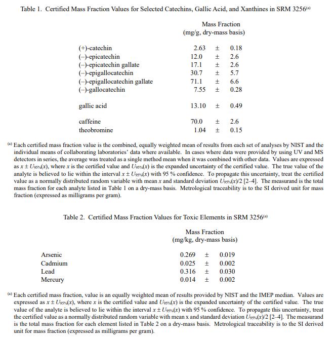 本材料中兒茶素和黃嘌.呤的認(rèn)證值是各組結(jié)果的同等加權(quán)平均值;元素的認(rèn)證值是 NIST 結(jié)果的平均值和合作實(shí)驗(yàn)室結(jié)果的中位數(shù)的加權(quán)平均值。相關(guān)的不確定性是 95% 置信水平的擴(kuò)展不確定性 [2-4]。