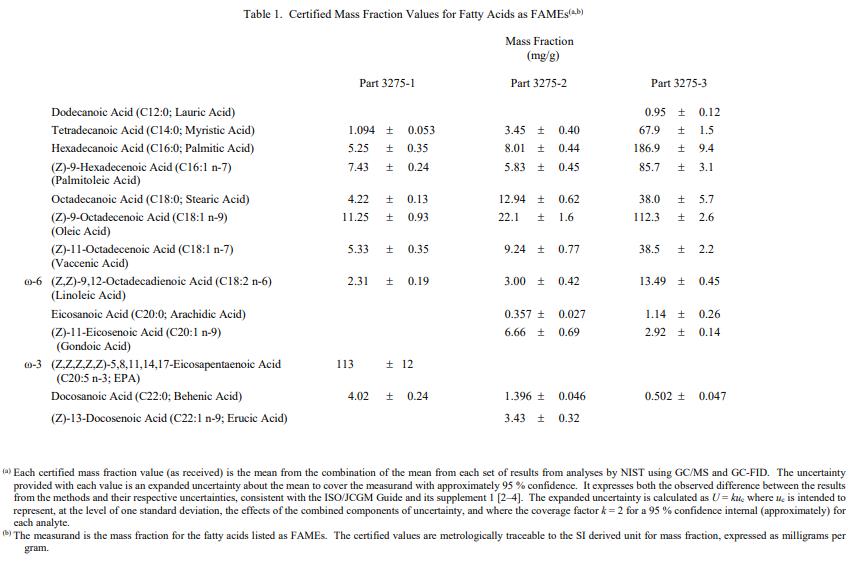 表 1 中提供了脂肪酸的認證質量分數值。NIST 認證值是 NIST 對其準確性有最高置信度的值,因為所有已知或可疑的偏差來源都已被調查或采用考慮[1]。 NIST 使用兩種獨立的方法對賦值進行了分析。所有認證值均計算為每個平均值的平均值方法。相關的不確定性以 95% 的置信水平表示 [2-4]。值以質量分數單位 [5] 以收到的形式報告。
