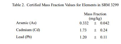 表 1 和表 2 提供了 SRM 3299 中姜黃素和元素的認(rèn)證質(zhì)量分?jǐn)?shù)值,以干質(zhì)量為基礎(chǔ)報告。NIST 認(rèn)證值是 NIST 對其準(zhǔn)確度有最高置信度的值因為所有已知或可疑的偏見來源都已被調(diào)查或采取考慮[1]。價值分配分析由 NIST 和合作實驗室進行。認(rèn)證值計算為 NIST 方法平均值的未加權(quán)平均值和合作實驗室平均值的加權(quán)中值(在適當(dāng)?shù)那闆r下)。相關(guān)的不確定性以大約 95% 的置信水平表示 [2-4]。