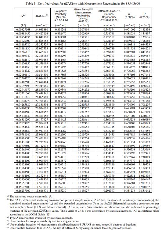NIST SRM 3600小角度X射線散射強度校準(標準品)試樣的平均厚度是 1.055 毫米 ± 0.025 毫米,基于對 56 個試樣中的每一個進行兩次獨立的微米厚度測量。與數值一起列出的不確定性是覆蓋因子 k = 2 的擴展不確定性,對應于 95% 的置信區間,預期單個試樣,并且來自重復測量的標準偏差。信息值被認為是可能對 SRM 用戶有用的值,但沒有足夠的信息來評估與該值相關的不確定性或僅是有限的