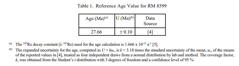表 1 中提供了 Henderson 輝鉬礦的參考年齡。參考值 [1]是一個未經證實的值,它是對真實值的最佳估計;但是,該值不符合 NIST 的認證標準,并且提供了相關的不確定性,這些不確定性可能僅反映測量精度,可能不包括所有不確定性來源。